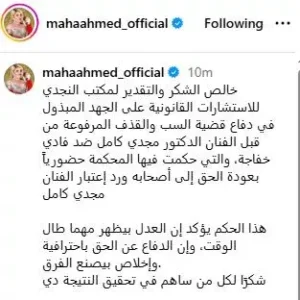وفي أول تعليق لها على الحكم، كتبت الفنانة مها أحمد عبر حسابها الرسمي على موقع “إنستجرام”: “خالص الشكر والتقدير لمكتب النجدي للاستشارات القانونية على الجهد المبذول في الدفاع عن قضية السب والقذف المرفوعة من قبل الفنان الدكتور مجدي كامل ضد فادي خفاجة، والتي حكمت فيها المحكمة حضورياً بعودة الحق إلى أصحابه ورد اعتبار الفنان مجدي كامل”.
